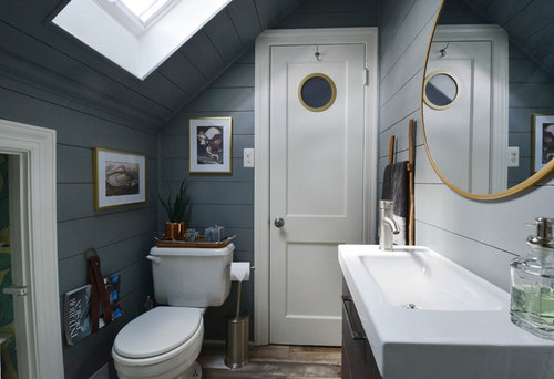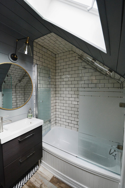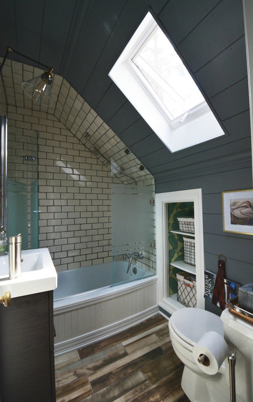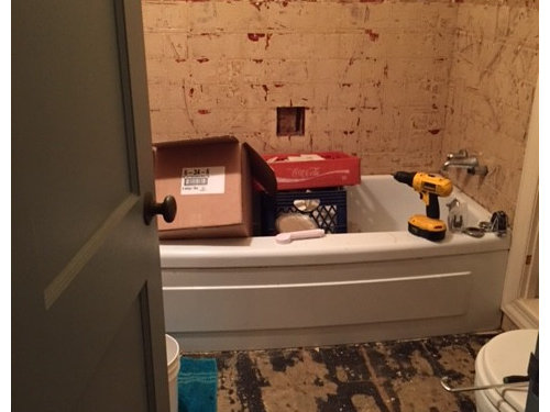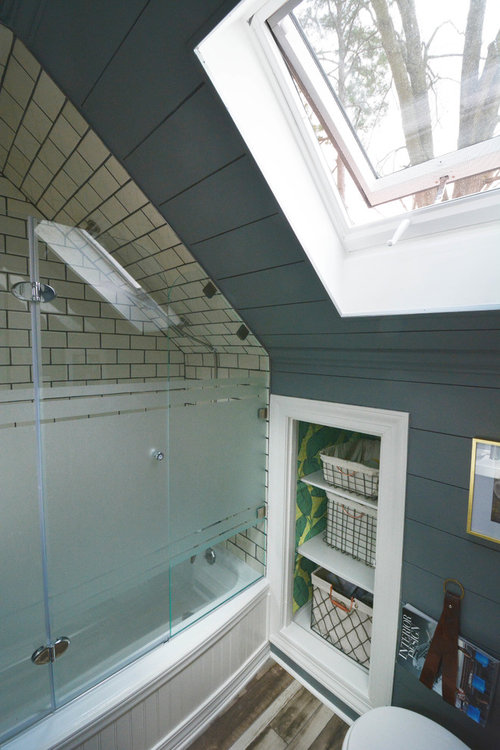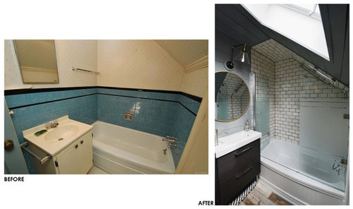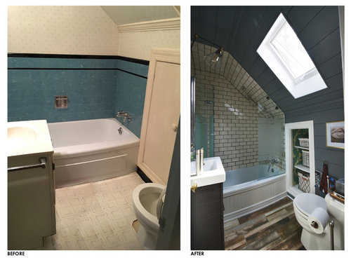 This is my 100% DIY bathroom renovation. I had no prior construction experience so it was a learn as I went experience. Even the venting skylight was installed by my coworker (he's an architect). I converted the tub-only into a functioning shower so now we have two in the house.