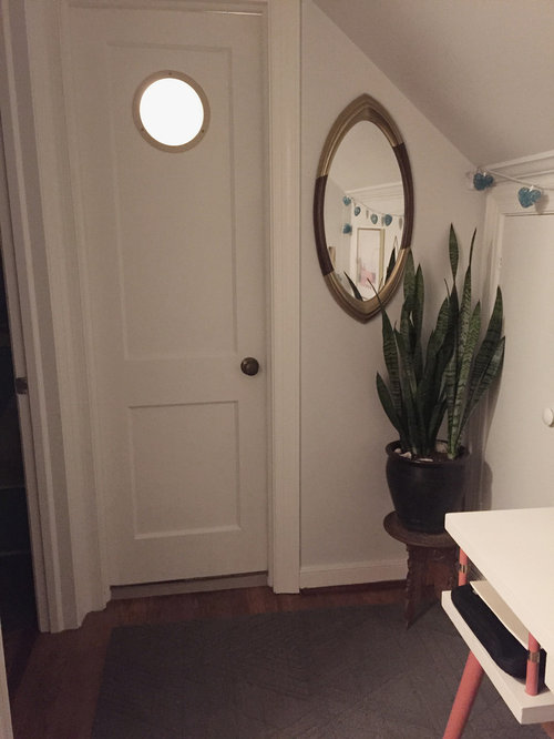hallway and entrance to bathroom with a porthole installed which has privacy film