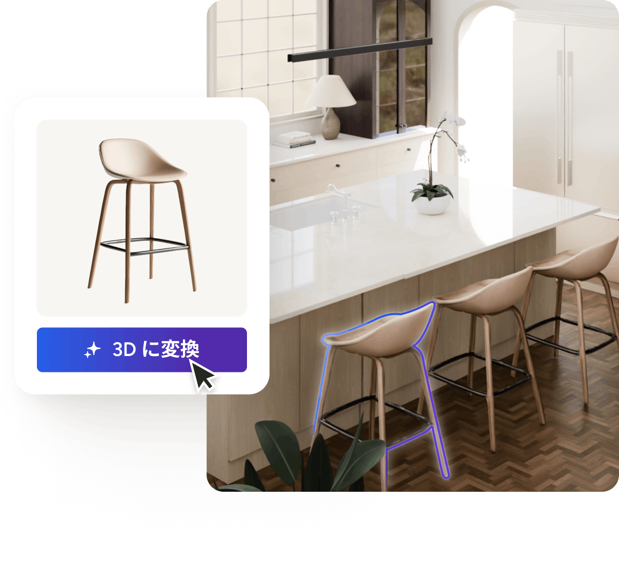 AI を使って商品写真を 3D モデル化して Houzz Pro の 3Dフロアプランナーに組み込めば、さらに具体的な間取り図を作成でき、空間のビジョンをより強調して顧客へ売り込むことができます。