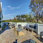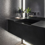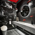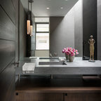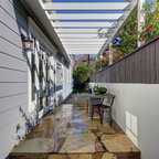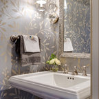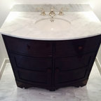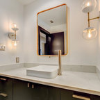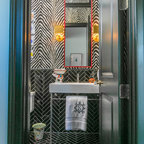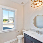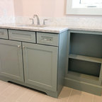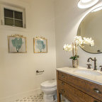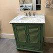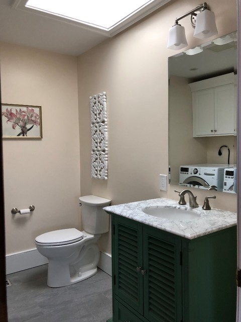フィラデルフィアの中サイズのカントリー風おしゃれなトイレ・洗面所 (ルーバー扉のキャビネット、緑のキャビネット、分離型トイレ、白い壁、セラミックタイルの床、アンダーカウンター洗面器、大理石の洗面台、グレーの床、白い洗面カウンター) の写真 — Houzz