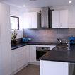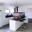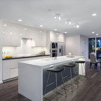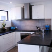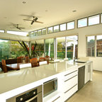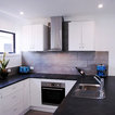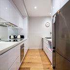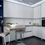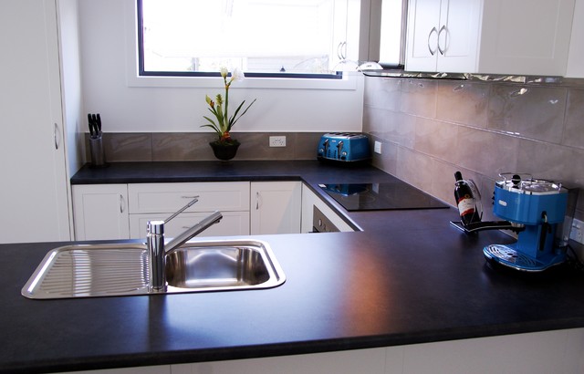 他の地域の中サイズのコンテンポラリースタイルのおしゃれなキッチン (シングルシンク、落し込みパネル扉のキャビネット、白いキャビネット、ラミネートカウンター、グレーのキッチンパネル、磁器タイルのキッチンパネル、カラー調理設備、磁器タイルの床、グレーの床、グレーのキッチンカウンター) の写真 — Houzz