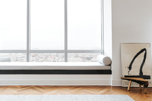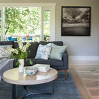 サンフランシスコの大きい北欧スタイルのおしゃれな独立型リビング (白い壁、無垢フローリング、暖炉なし、茶色い床) の写真 — Houzz