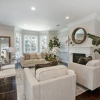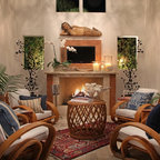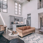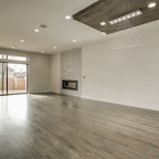 サンフランシスコの中サイズのコンテンポラリースタイルのおしゃれな独立型リビング (グレーの壁、ラミネートの床、標準型暖炉、タイルの暖炉まわり、茶色い床) の写真 — Houzz