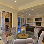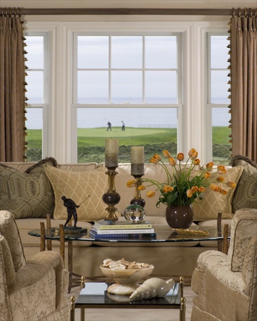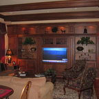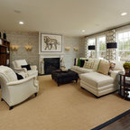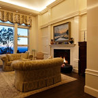サンフランシスコの中サイズのトラディショナルスタイルのおしゃれなファミリールーム (ベージュの壁、無垢フローリング、標準型暖炉、木材の暖炉まわり) の写真 — Houzz