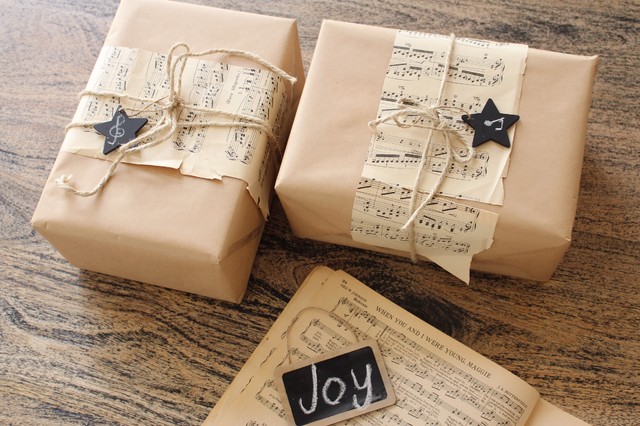 贈る相手の趣味や興味に合わせて自分の趣味や興味を尊重した贈り物を受け取れば、うれしいものですよね。一目見ただけで相手が心奪われるような包装紙、リボン、飾りを選びましょう。例えば写真のように、音楽好きの人へのプレゼントには、古い楽譜をラッピングにして。クリスマスキャロルの楽譜なら、クリスマスシーズンにぴったりですね。