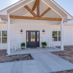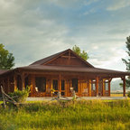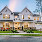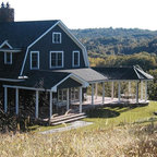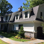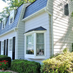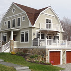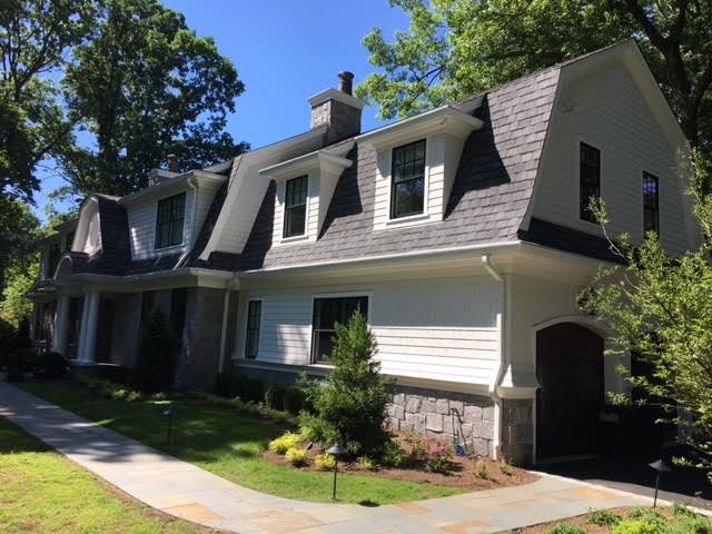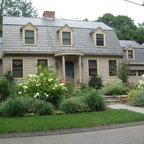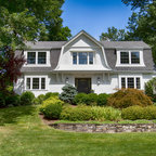 ニューヨークのカントリー風おしゃれな家の外観 (木材サイディング、腰折れ屋根、戸建、板屋根) の写真 — Houzz