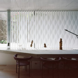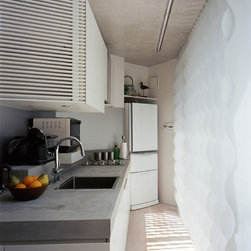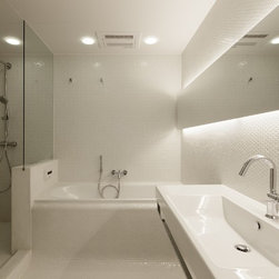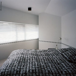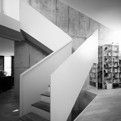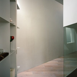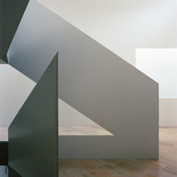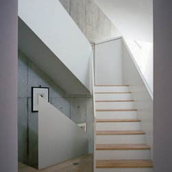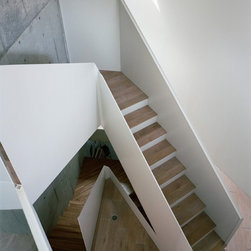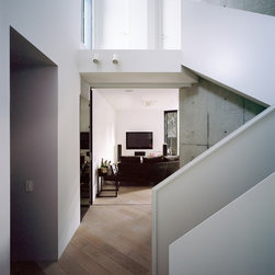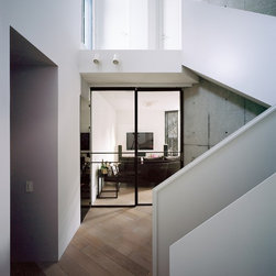 2階においても斜めに切り取られた建物形状から、階段を中心に鋭角に展開する回遊性のあるシークエンスが創出された。LDKには三角の余白より外光が十分に採り込まれ、北側のラウンジホールには西端にトップライト、東端にハイサイドライトを設けることで明るさを獲得した。この空間は時間により光の射し込み方が変化し、白い壁面と白い階段の各面にグラデーショナルに光の色を落としている。北側に配置され裏動線になりがちな階段室とエントランスギャラリーに立体的なかたちと光の表情を与えることで、多様な雰囲気を生み出すと共に世帯間の気配を自然と感じさせる空間をつくり出した。