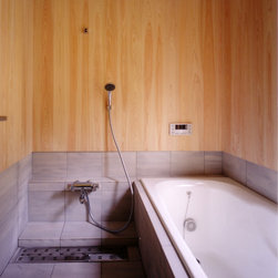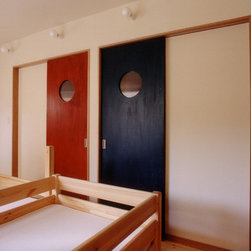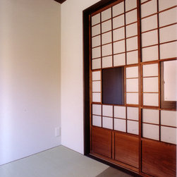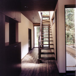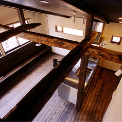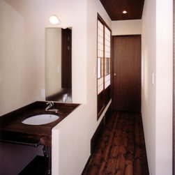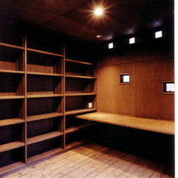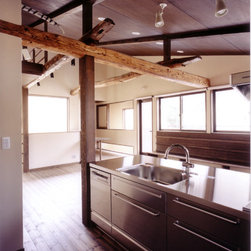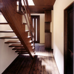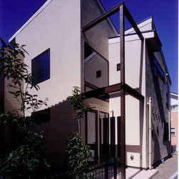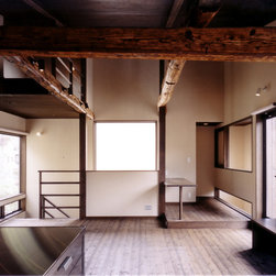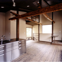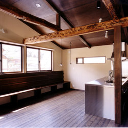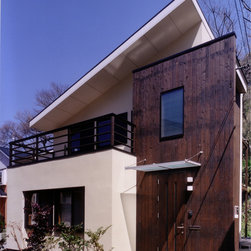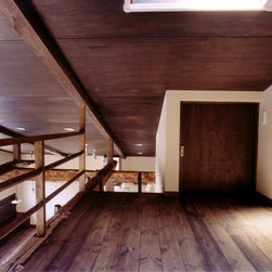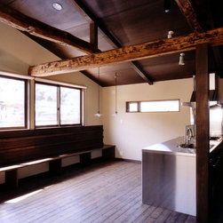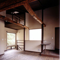 鎌倉の山間の閑静な環境に立地しているので、落ち着いた年月を経て建っているかのようなデザインをイメージを意図しました。 内部は建主さんの希望で梁と建具の一部に古材を使用。塗壁の明るい珪藻土に対比して床・壁・建具などの木部は濃茶色でダークな色調としています。天井はラワン合板に塗装し、新築ですが馴染みやすい懐かしさ ・心地よさが感じられます。全体の構成は1Fが寝室・書斎(仕事場)、2FがLDKと洗面・浴室です。