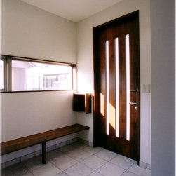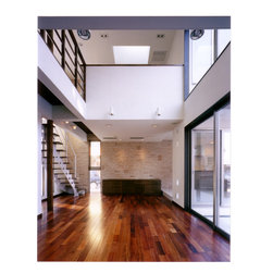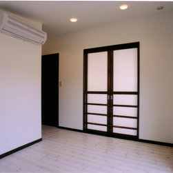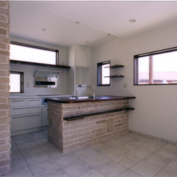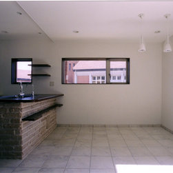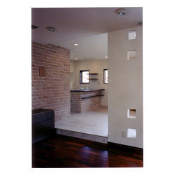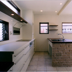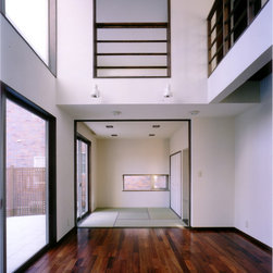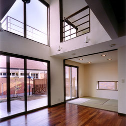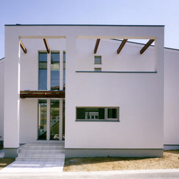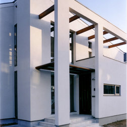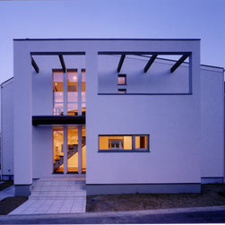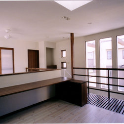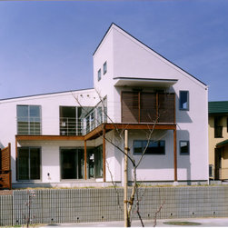 稲城市の閑静な環境の新規分譲地に立地。比較的ゆったりした敷地にプランはL型に配置して、タイル張りのテラスを設けました。外観は白壁で、シンプルですっきり清々しい構成。内部も白壁をベースに板貼りはこげ茶でアクセントを付け、ホテルのようなインテリアイメージとしました。コストを抑えながらも仕上材は珪藻土、無垢のフローリング、キッチンもオリジナルで、造作等こだわりを持たせています。中心となるリビングを吹抜にして開放感を持たせ、階段のデザインと大きな開口部が内外の特徴付けています。