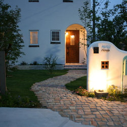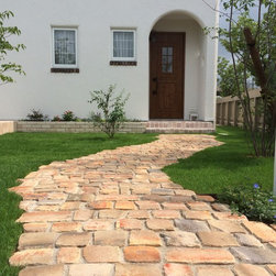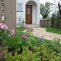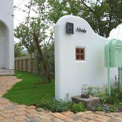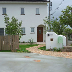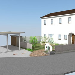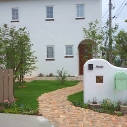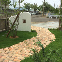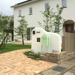 ナチュレホームの建物に合わせて、アンティークレンガの石畳、丸みを帯びた曲線の門柱、天然木の縦張フェンスなどでお施主様のお気に入りやこだわりをカタチにしました。