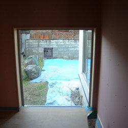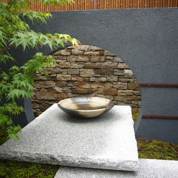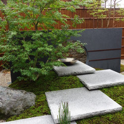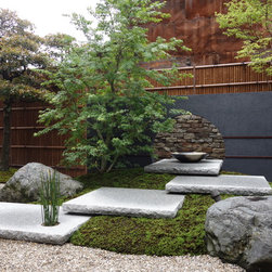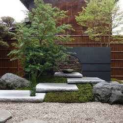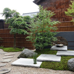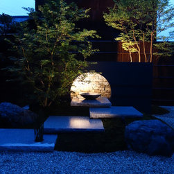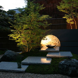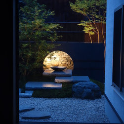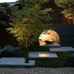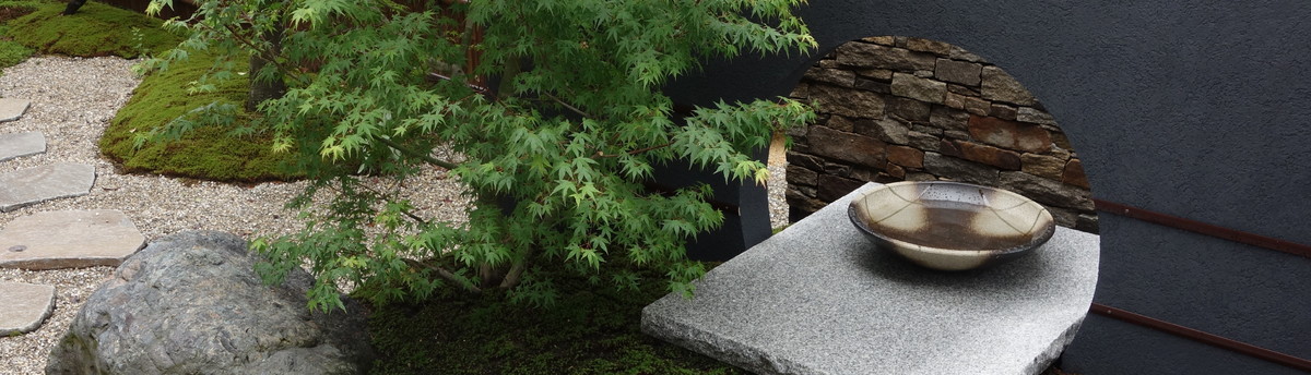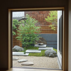 母屋のリビング窓と新宅の玄関を開けると飛び込んでくるピクチャーウィンドウからの景色を意識してデザインした和風モダンな中庭です。
