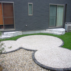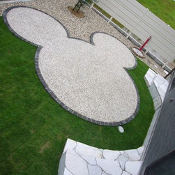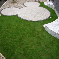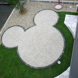 ご家族全員が大好きだという、ミッキーを模ったテラスがある芝生のお庭の施工例です。ユーティリティールームとLDKからそれぞれ庭に下りれるように新設した階段は、ミッキーと一体となったデザイン。リビングや二階の子供部屋からの眺めを考慮しながらミッキーの角度を決めました。隠れミッキーもいる遊び心がいっぱいのお庭です。