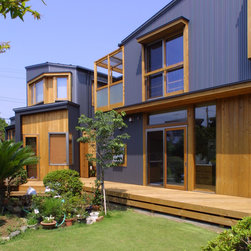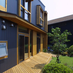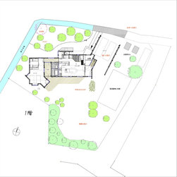 古くから茅ヶ崎に残る、土塁と堀、里山のような既存樹木を可能な限り取り除かずに、平面計画を寄り添わせました。あたかも日本列島のような配置が生まれました。手の届く範囲で天然素材をあしらいました。ダークグレーメタリックの金属板と自然素材が美しいコントラストをなしています。