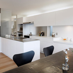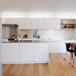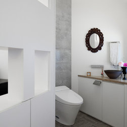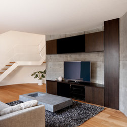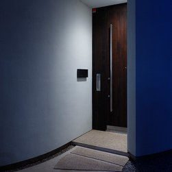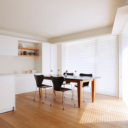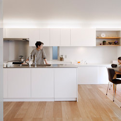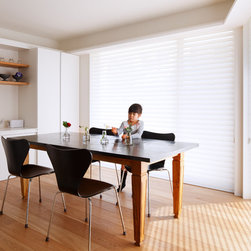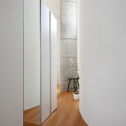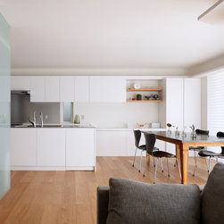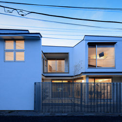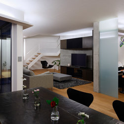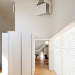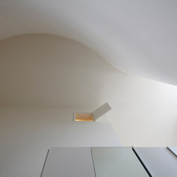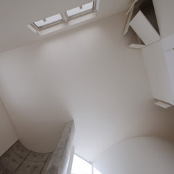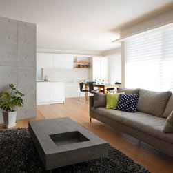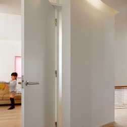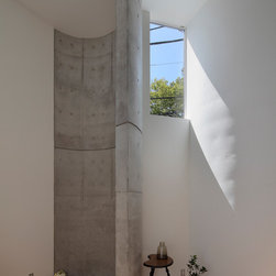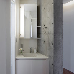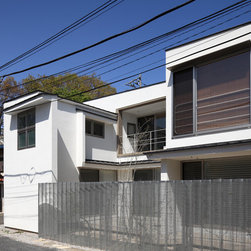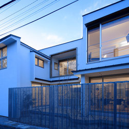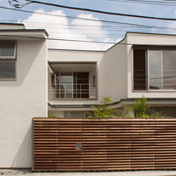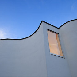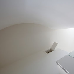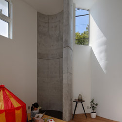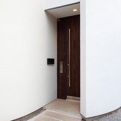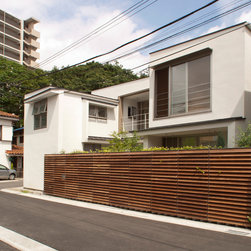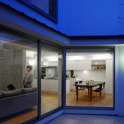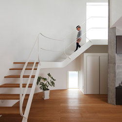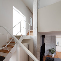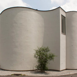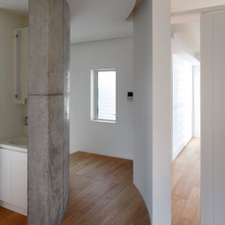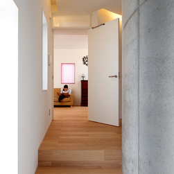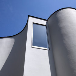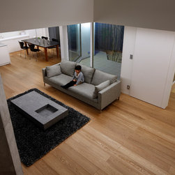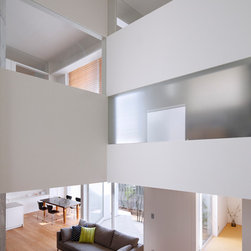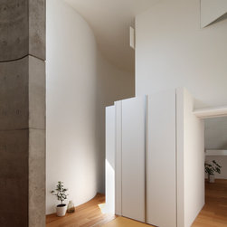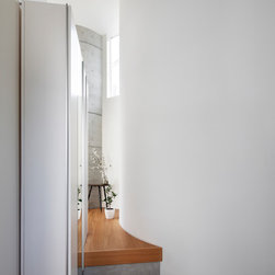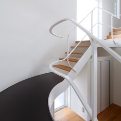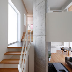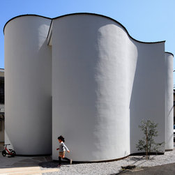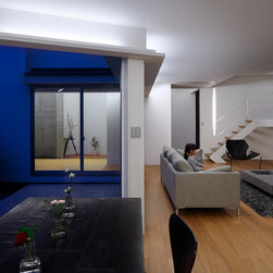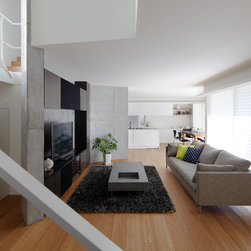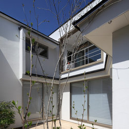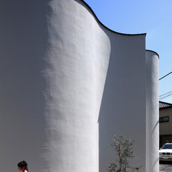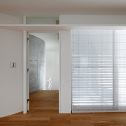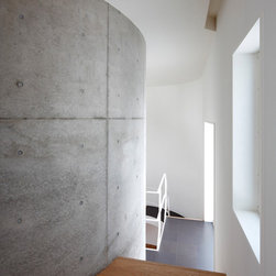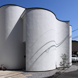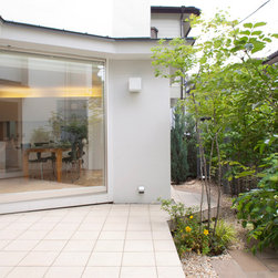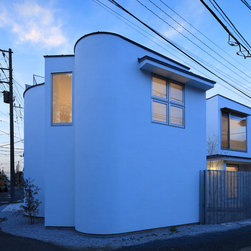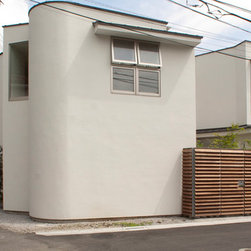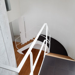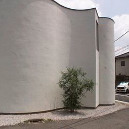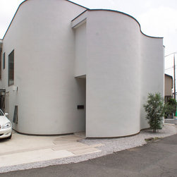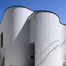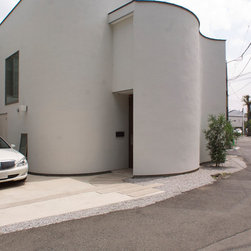 多角形に道路に接する土地。交通量もけっしてすくなくない、そんな街角に円弧を組合せて馴染ませた印象深い外観。落着いた中庭と伸びやかなインテリア。無垢の板と白壁、内放しのコンクリートがクールで温かな印象を醸し出しています。