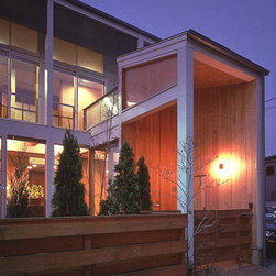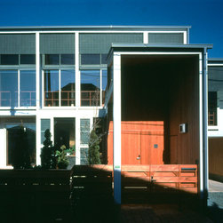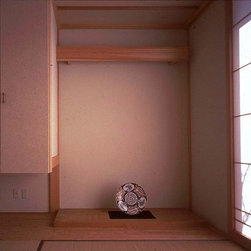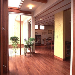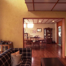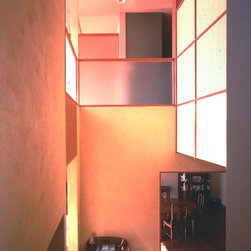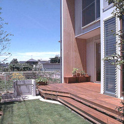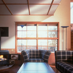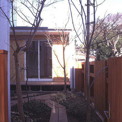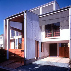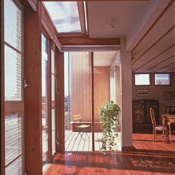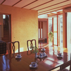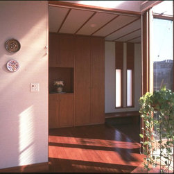 この住まいでは、周囲の建物、とりわけ南側に存在する3階建て住宅の日影を入念に調査。 冬の太陽がありがたい季節にすべての部屋の奥深くまで陽射しがとどく間取りと窓の工夫をしています。 但し、夏の強い陽射しは完全にカット。その積極的な仕掛けとして、軒先きに遮光ルーバーをデザインしています。 また、温熱環境をできるだけバリアフリーにする、すなわち、部屋ごとに寒暖の差をできるだけおこさない工法を徹底しています。 床下の蓄熱コンクリートを温水パイプで暖めて、床下空間の空気を暖めることで、 床暖房の直接的な輻射とは違う柔らかな温輻射を作りだします。更に暖かい空気が上昇する原理を利用し、 外断熱層の内側と部屋の壁仕上げのあいだに(内かべ空洞と呼ぶ)この空気を上手に流し、 更に2階床、 2階壁、2階天井と部屋全体を暖かい空気ですっぽりと包み込みます。床、壁、天井の表面温度を均一にすることが輻射暖房の理想型ですが、 木造でそれを成し遂げています。なお、冬場に一般的な木造住宅は壁体内で結露する可能性が非常に高いのですが、 この暖房システムによって、柱、梁という主要構造体の存在する場所に「乾燥した暖かい空気」を充填するため、 構造体の乾燥が促進されます。総じて太陽と温熱環境的アプローチからデザインを詰めた住宅です。