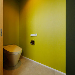Tさまこだわりのトイレ。和らぎをもたらす渋い柳色に、マットブラックのクロスを組み合わせました。茶室のような落ち着きのある和テイストの空間にメリハリをきかせたモダンな仕上がりです。