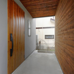 玄関アプローチは、雨風除けと共に道路側からの目隠しとしての役割も果たしています。天井と正面の壁には木材をあしらい、表情のある仕上がりに。自転車を並べておけるだけのゆとりのスペースを確保しました。