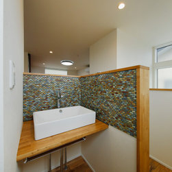 水回りのデザインもTさまのこだわり。洗面台は壁を手元までの高さにして、抜け感のある開放的な空間デザインに。細かなモザイクタイルをあしらいました。