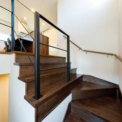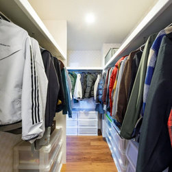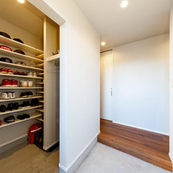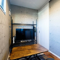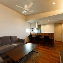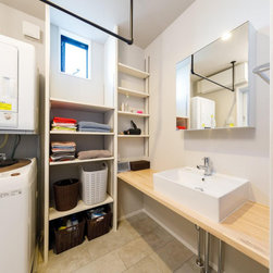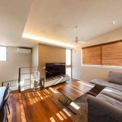 バーカウンター風のキッチンや開放的な勾配天井のシーリングファンが、落ち着いた開放感を創出しています。その他、限られた空間に効率よく目的が明確なスペースを構築していきました。中でも特徴的なのが、2階キッチンのバックヤードに設けた子ども室。将来お子様が帰宅した際に、必ずキッチンで家族が顔を合わせるように考えられています。
