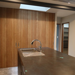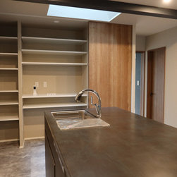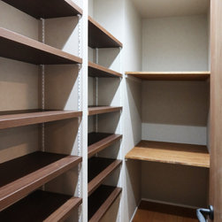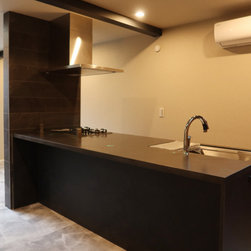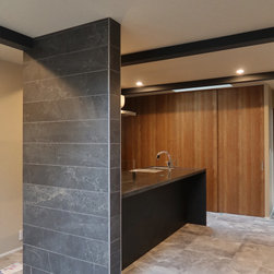 2種の石目タイルと、木目クロスの組み合わせがシックにまとまったバーカウンター風キッチンには、お料理好きなお施主様のこだわりで、冷蔵庫まで隠れてしまう大きな収納も設けました。