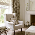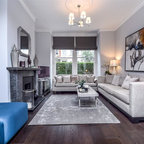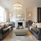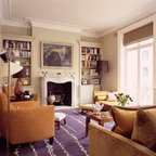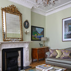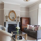 ウエストミッドランズのトランジショナルスタイルのリビング・居間の画像 (フォーマル、ベージュの壁、標準型暖炉、テレビなし) —