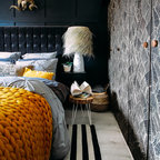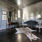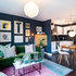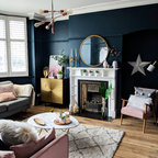 ロンドンのエクレクティックスタイルのリビング・居間の画像 (黒い壁、濃色無垢フローリング、黒い床) —