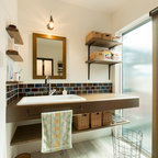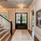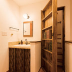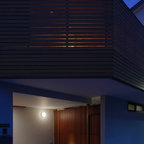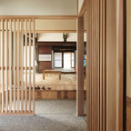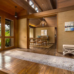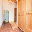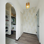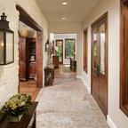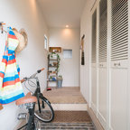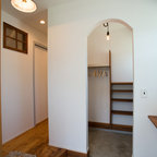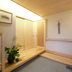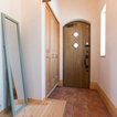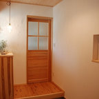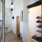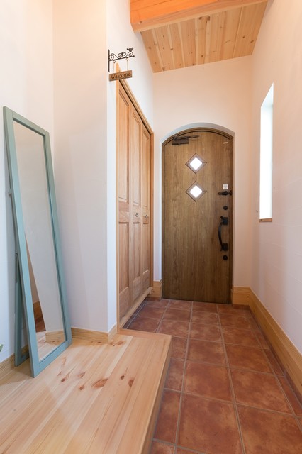他の地域の片開きドアアジアンスタイルのおしゃれな玄関ホール (白い壁、テラコッタタイルの床、木目調のドア、オレンジの床) の写真 — Houzz