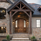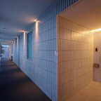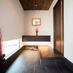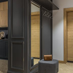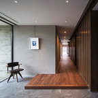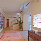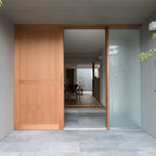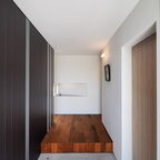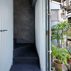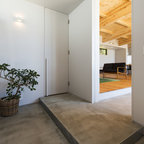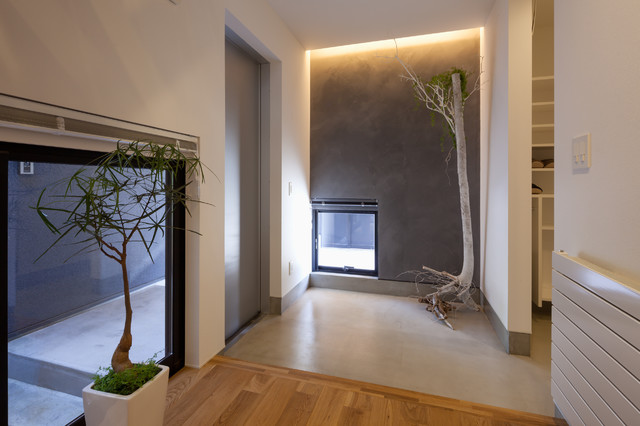 他の地域の片開きドアコンテンポラリースタイルのおしゃれな玄関ホール (マルチカラーの壁、コンクリートの床、金属製ドア、グレーの床) の写真 —  Houzz