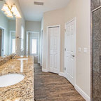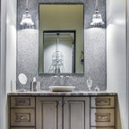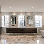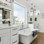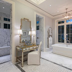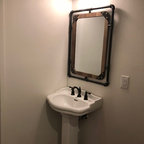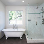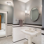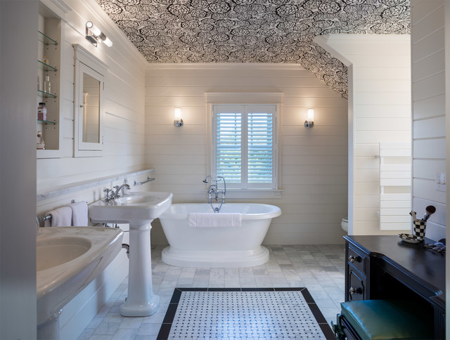 プロビデンスのカントリー風おしゃれな浴室 (置き型浴槽、白い壁、大理石の床、ペデスタルシンク) の写真 — Houzz