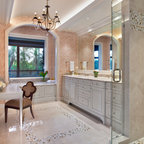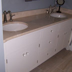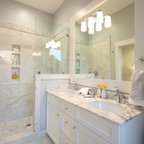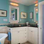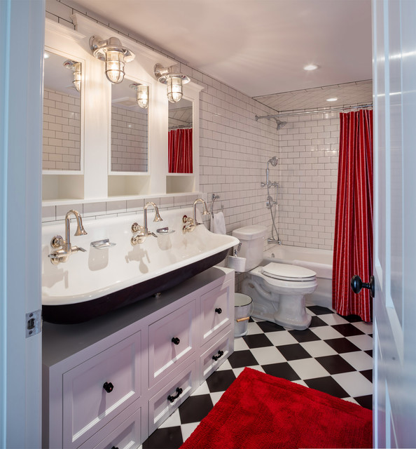 プロビデンスのカントリー風おしゃれな子供用バスルーム (白いキャビネット、ドロップイン型浴槽、白いタイル、サブウェイタイル、白い壁、磁器タイルの床、横長型シンク) の写真 — Houzz
