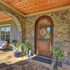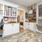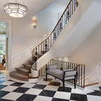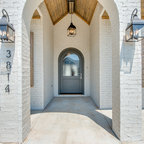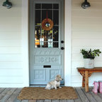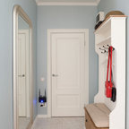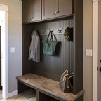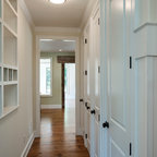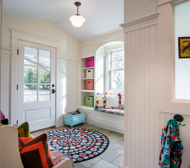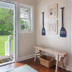プロビデンスの片開きドアカントリー風おしゃれなマッドルーム (白い壁、白いドア、茶色い床) の写真 — Houzz