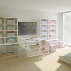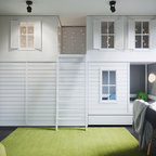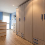 他の地域の中くらいのコンテンポラリースタイルのおしゃれな子供部屋 (青い壁、濃色無垢フローリング、ティーン向け、茶色い床) の写真 — Houzz