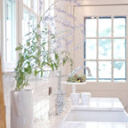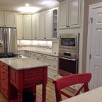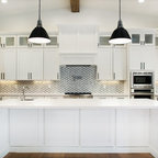 ロサンゼルスのカントリー風おしゃれなキッチン (アンダーカウンターシンク、シェーカースタイル扉のキャビネット、白いキャビネット、クオーツストーンカウンター、グレーのキッチンパネル、大理石のキッチンパネル、シルバーの調理設備、ラミネートの床、茶色い床) の写真 — Houzz