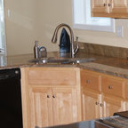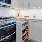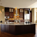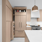 サンフランシスコのコンテンポラリースタイルのおしゃれなキッチン (フラットパネル扉のキャビネット、オレンジのキャビネット、無垢フローリング) の写真 — Houzz