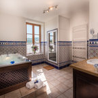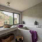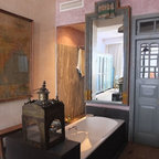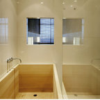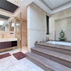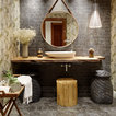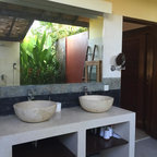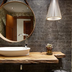 他の地域のアジアンスタイルのおしゃれな浴室 (グレーのタイル、サブウェイタイル、ベッセル式洗面器、木製洗面台、グレーの床、ブラウンの洗面カウンター) の写真 — Houzz