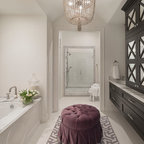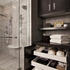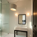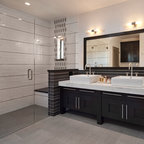 SImple lines and gray tile. Mirror. What about storage? Can we do it with cabinet adjacent to sink?