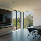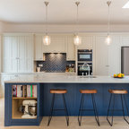 A hob set into the peninsula worktop allows those cooking to face outwards into the room, while a couple of bar stools allow the worktop to be transformed into a practical breakfast bar in the mornings or a spot to relax in with a glass of wine in the evenings.A bank of tall units discreetly houses the Miele appliances and an open shelving unit offers plenty of room to display glassware and crockery.Microwave combination oven, steam combination oven, oven, built-in fridge-freezer, 2-1 induction hob, built-in wine cooler, dishwasher, robot vacuum cleaner, all Miele. Misty Fjord tiles, Topps Tiles.Shop everything in the kitchen here