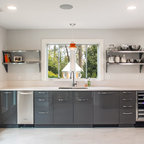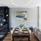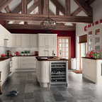 A hob set into the peninsula worktop allows those cooking to face outwards into the room, while a couple of bar stools allow the worktop to be transformed into a practical breakfast bar in the mornings or a spot to relax in with a glass of wine in the evenings.A bank of tall units discreetly houses the Miele appliances and an open shelving unit offers plenty of room to display glassware and crockery.Microwave combination oven, steam combination oven, oven, built-in fridge-freezer, 2-1 induction hob, built-in wine cooler, dishwasher, robot vacuum cleaner, all Miele. Misty Fjord tiles, Topps Tiles.Shop everything in the kitchen here wine fridge