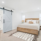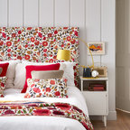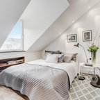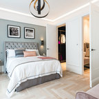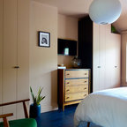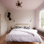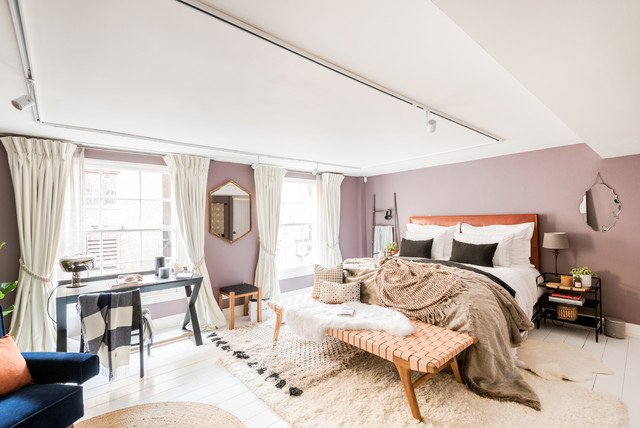 ロンドンの北欧スタイルのおしゃれな主寝室 (紫の壁、塗装フローリング、暖炉なし、白い床) のレイアウト — Houzz