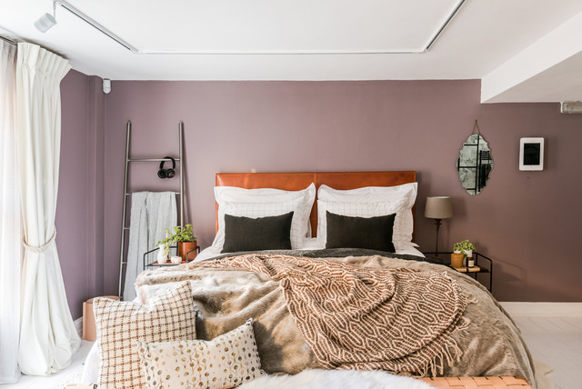 The bedroom is rich, cosy space that offers a strong dose of ‘hygge’, thanks to a cocooning wall colour, soft floor-length curtains and layer upon layer of plush textiles draped across the bed. The wall colour behind the bed is Dulux’s colour of the year 2018, Heart Wood, and the entire space has been designed to offer a soothing escape from the pressures of the outside world. Headphones, Bang & Olufsen. Blue and white checkered 2000t super king bed, headboard in cognac, and Stitch Anthracite bed linen, Hästens.