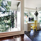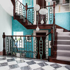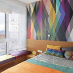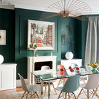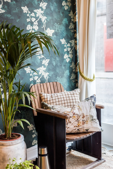 Houzz at a GlanceWho lives here The space was designed for a family with a young daughterLocation 19 Greek Street, LondonProperty Five-storey townhouseDesigner Run For the Hills, designed the space based on Houzz community insights and data to showcase 2018’s key interior trends.On arrival, a narrow entrance hallway has been transformed with an emerald green ivy-print wallpaper and a fold-up cinema chair offering a handy place to perch. A large potted palm adds height and a movement and a neat floor level speaker provides discreet sound.BeoSound 2, Bang & Olufsen. Tetbury Ivory curtains on a Brooklyn Graphite pole, Hillarys. Plants throughout, Patch.