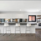 パースの中くらいのコンテンポラリースタイルのおしゃれなキッチン (アンダーカウンターシンク、フラットパネル扉のキャビネット、グレーのキャビネット、ステンレスカウンター、オレンジのキッチンパネル、ガラス板のキッチンパネル、シルバーの調理設備) の写真 — Houzz