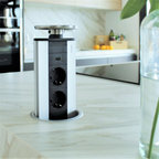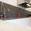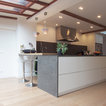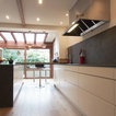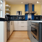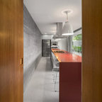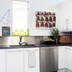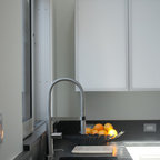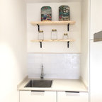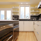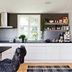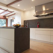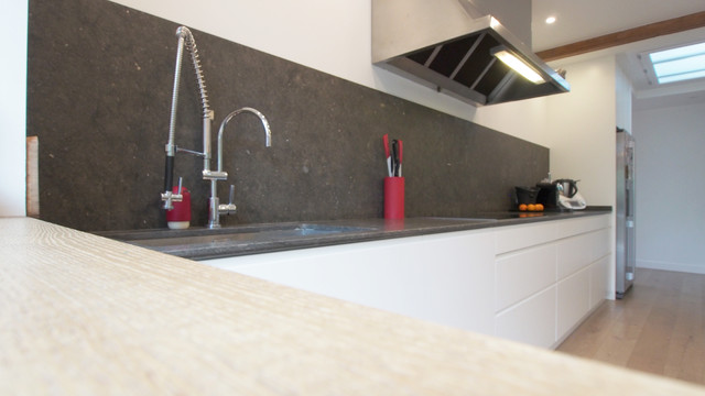 バルセロナの大きいコンテンポラリースタイルのおしゃれなキッチン (アンダーカウンターシンク、フラットパネル扉のキャビネット、白いキャビネット、ソープストーンカウンター、グレーのキッチンパネル、シルバーの調理設備、淡色無垢フローリング、ベージュの床) の写真 — Houzz