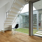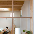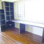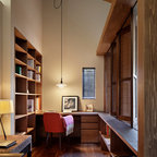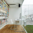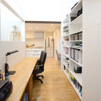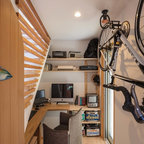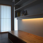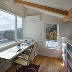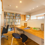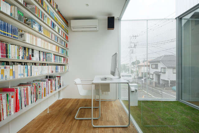 東京23区のモダンスタイルのおしゃれなホームオフィス・仕事部屋 (ライブラリー、白い壁、無垢フローリング、自立型机、茶色い床) の写真 — Houzz