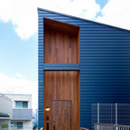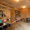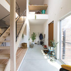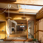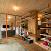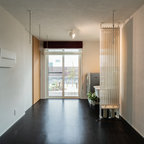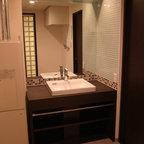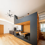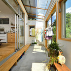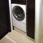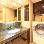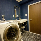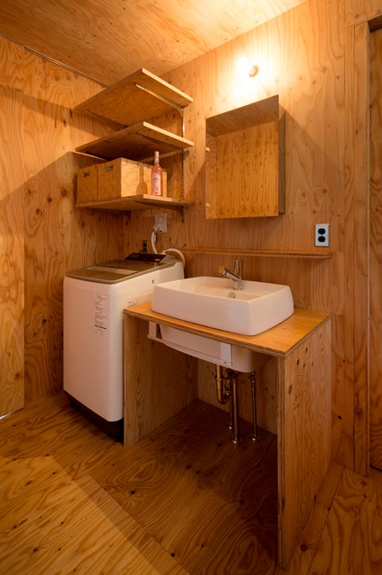 他の地域のコンテンポラリースタイルのおしゃれなランドリールーム (茶色い壁、無垢フローリング、茶色い床) の写真 — Houzz