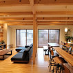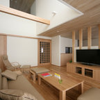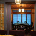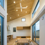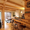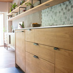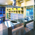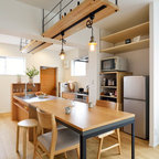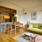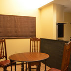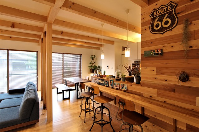 他の地域のモダンスタイルのおしゃれなホームバー (無垢フローリング、茶色い床、茶色いキッチンカウンター) の写真 — Houzz