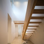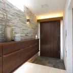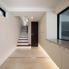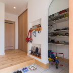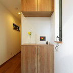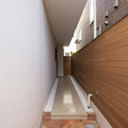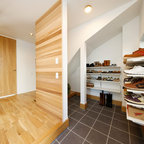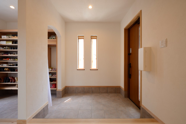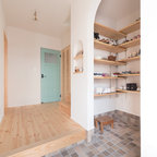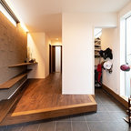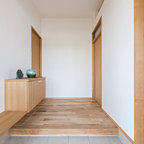 大阪の片開きドアモダンスタイルのおしゃれな玄関ホール (木目調のドア、グレーの床) の写真 — Houzz