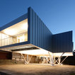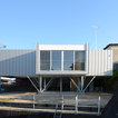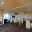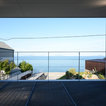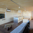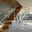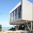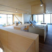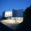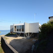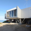 この敷地は海沿いから1区画奥まった場所ですが、全面が道路のため海が望める環境となっています。クライアントは長年海の見える家にあこがれ土地を探しつづけたとのことで、その思いをどのような形です解答するかがキーとなりました、平面計画としては1階を駐車スペースとガラス張りの玄関ホールのピロティーとし、2階にすべての機能を上げています。リビング、ダイニングからはバルコニーを通して海が望め、T字形の出っ張り方向は道路で見晴らしがよく、共にガラス張りの解放としています。外観は1階、H鋼の柱と、パイプの筋違の鋼材(メッキ処理)で固めたピロティー、2階はシルバーのガルバリウム鋼板としインパクトのあるメカニカル的なイメージを表現しています。