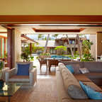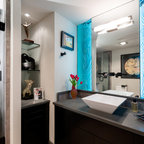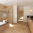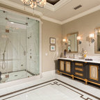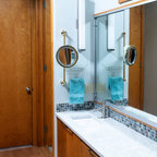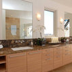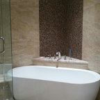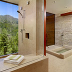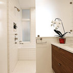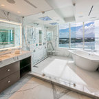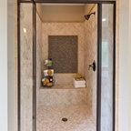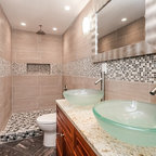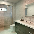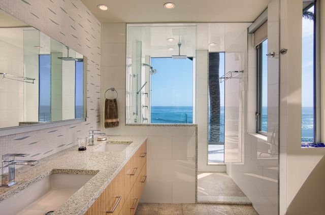 サンディエゴの大きいコンテンポラリースタイルのおしゃれなマスターバスルーム (アンダーカウンター洗面器、フラットパネル扉のキャビネット、中間色木目調キャビネット、アルコーブ型シャワー、白いタイル、磁器タイル、ベージュの壁、御影石の洗面台、オープンシャワー、一体型トイレ 、ベージュの床) の写真 — Houzz