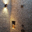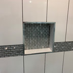 White shiny Shower Tile continues on outside Pony Wall. But do not do an accent tile on top of Pony Wall.
